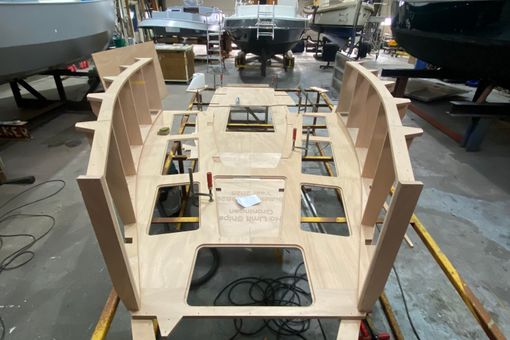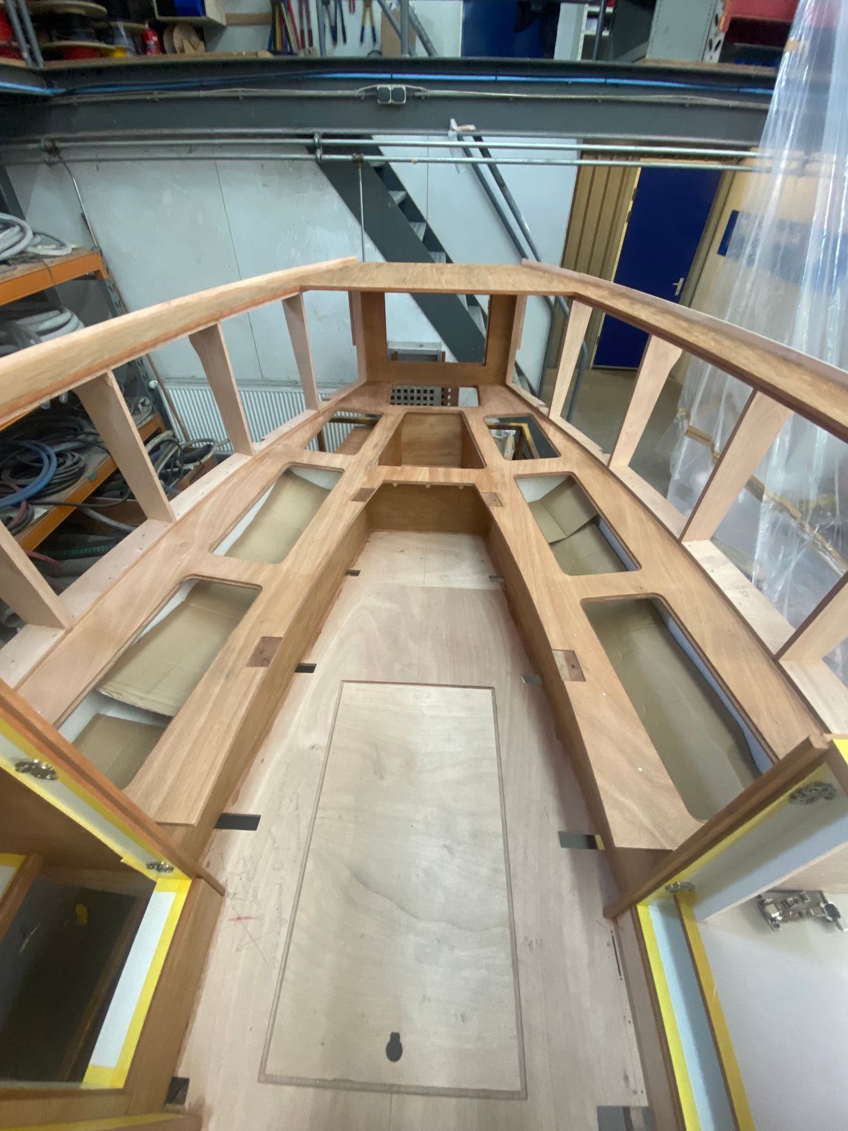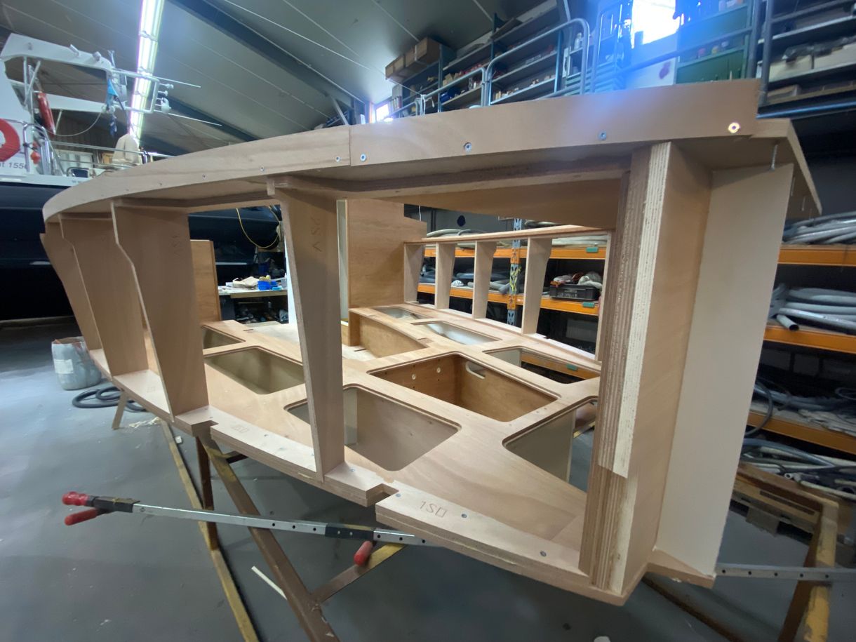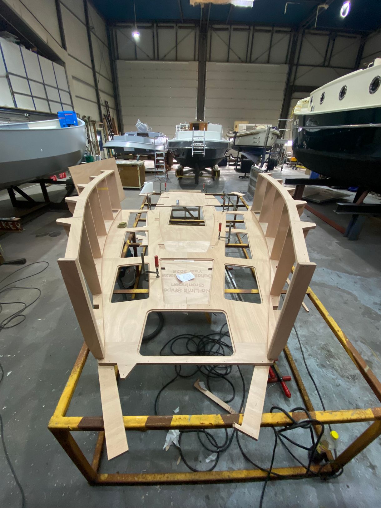 Because the hull consists of two separate sections — the hull and the deck — we are able to lift the entire interior into the hull in a single operation. The deck is then installed afterward. This method allows us to build the interior under optimal conditions.
