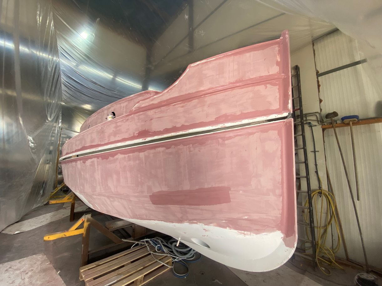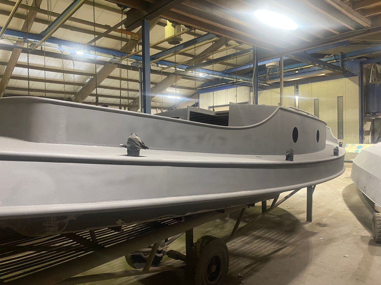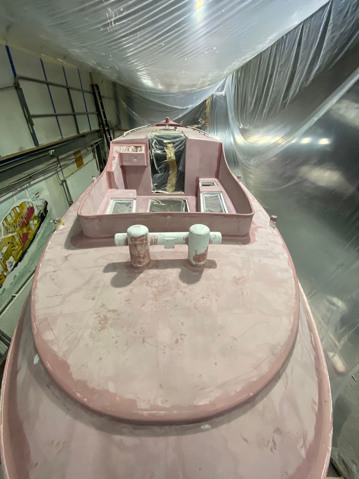 To achieve a perfectly smooth hull, a significant amount of filler is applied to the steel structure. The entire hull is then repeatedly filled and sanded until the surfaces of both the hull and the deck are completely even and smooth. Only then is it ready for the application of the first primer coat.